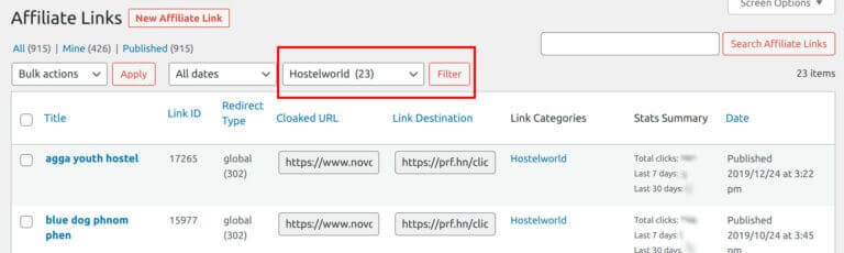 Using the HostelWorld example, I could simply open the ThirstyAffiliates menu, filter by the “HostelWorld” category, and update the destination URL. A platform change that once took us two full days could now be done in just 10 minutes with ThirstyAffiliates.