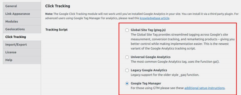 With ThirstyAffiliates, if Google Analytics is already installed on your site, enabling automatic affiliate click tracking takes just one click. While ThirstyAffiliates does have its own click tracking system, I’ve found Google Analytics to be far more accurate and it’s much more convenient to have all my stats in one place.
