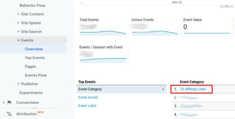 Once you enable Click Tracking, Google Analytics will display a new event category under Behaviour → Events → Overview. By default, it’s called Affiliate Link, but in my case, I renamed it to TA Affiliate Links in the ThirstyAffiliates settings under Custom Event Category Name.