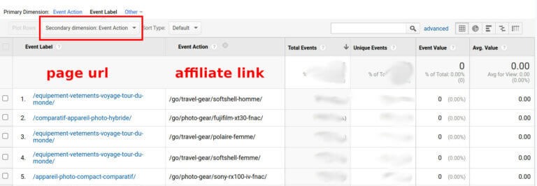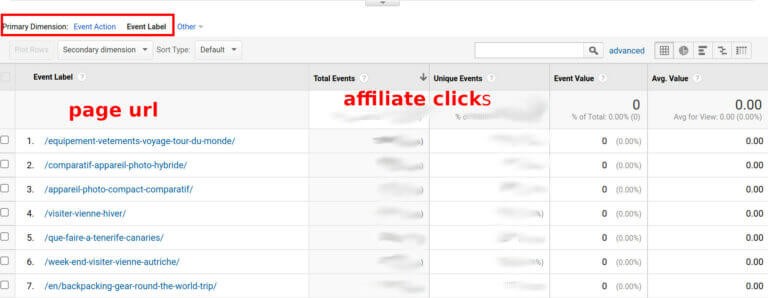 After selecting this event category, you’ll notice some useful insights. Change the primary dimension to Event Label to see which pages generate the most affiliate link clicks. For even deeper analysis, add Event Action as a secondary dimension this will show you the most-clicked affiliate links on each individual page.
